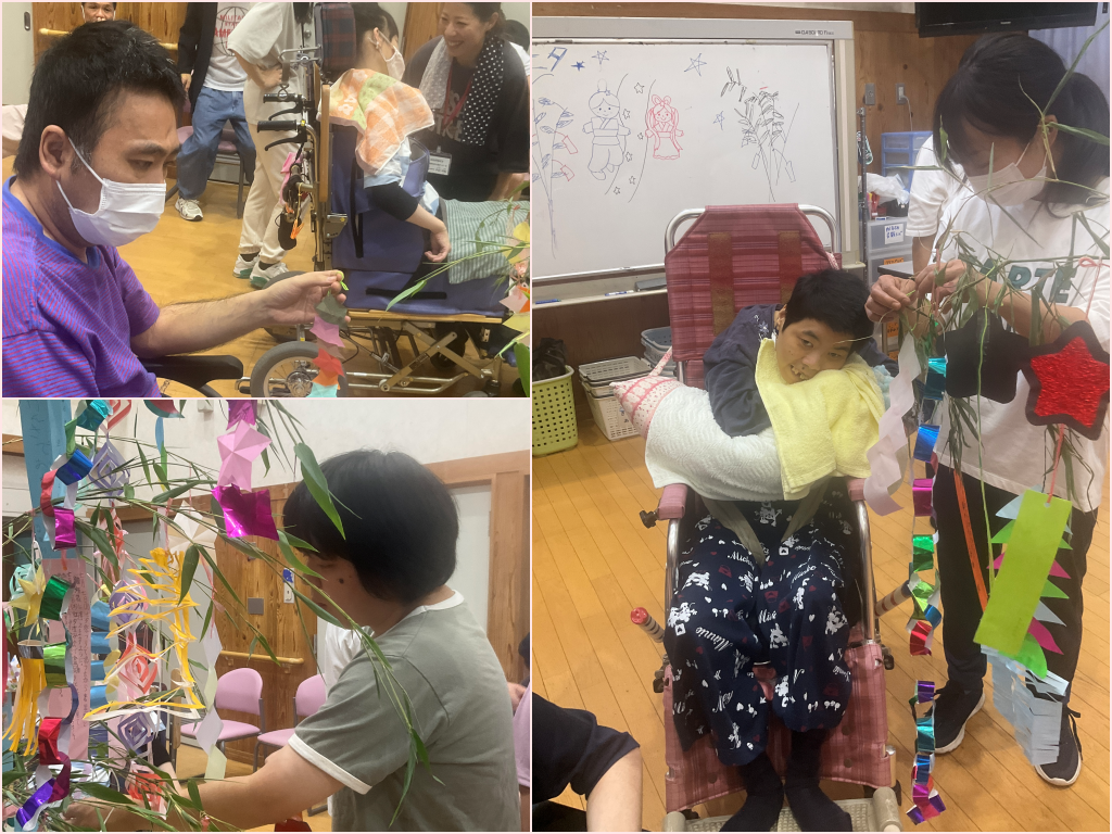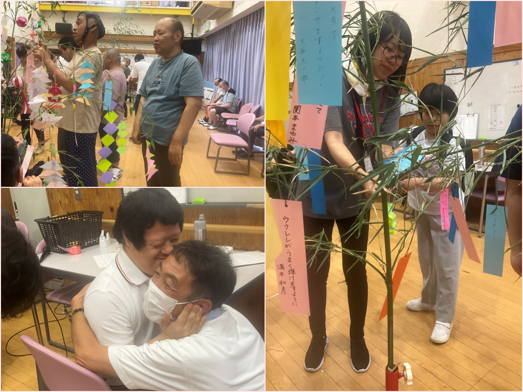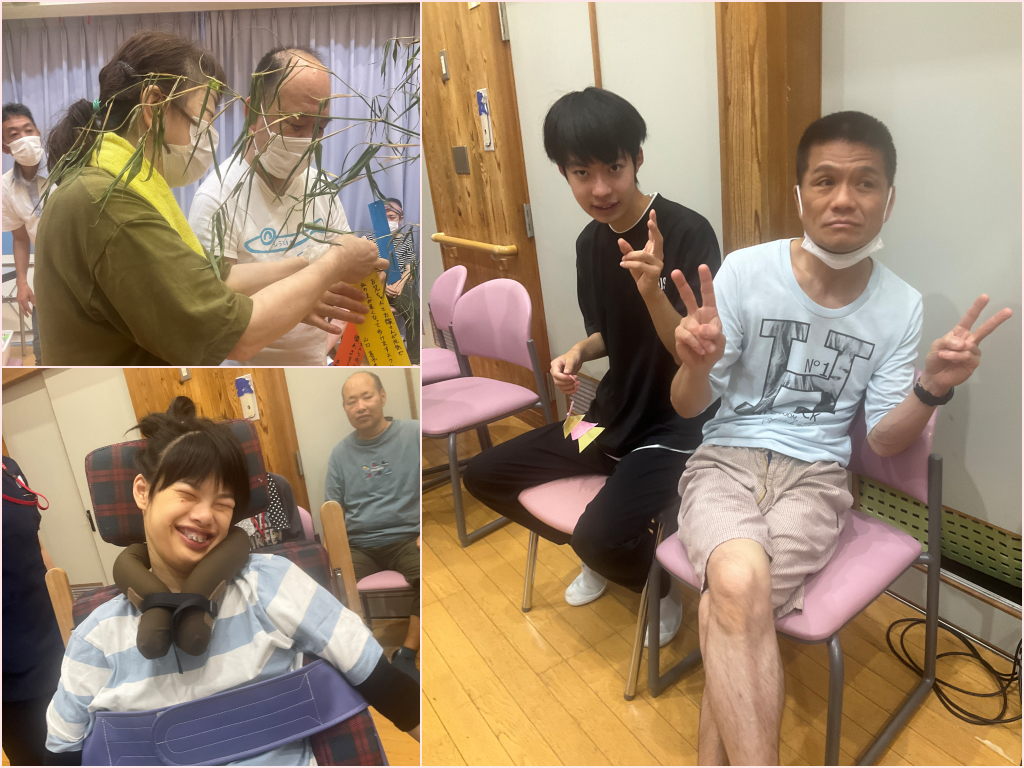 7月7日(月)、虹では七夕行事を催しました。各チームの活動時に制作した七夕飾りや短冊を笹に結び、願いを掛けています。「願いが叶うかな?」とみなさんドキドキとワクワクが入り混じった様子でとても楽しそうに過ごされていました。