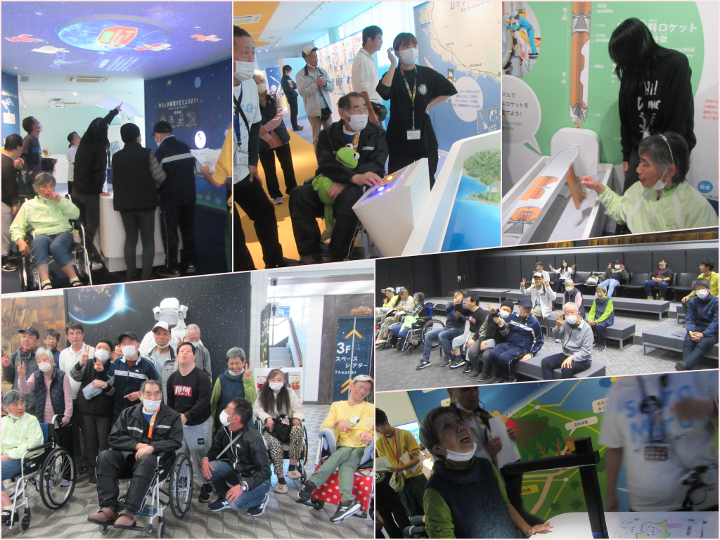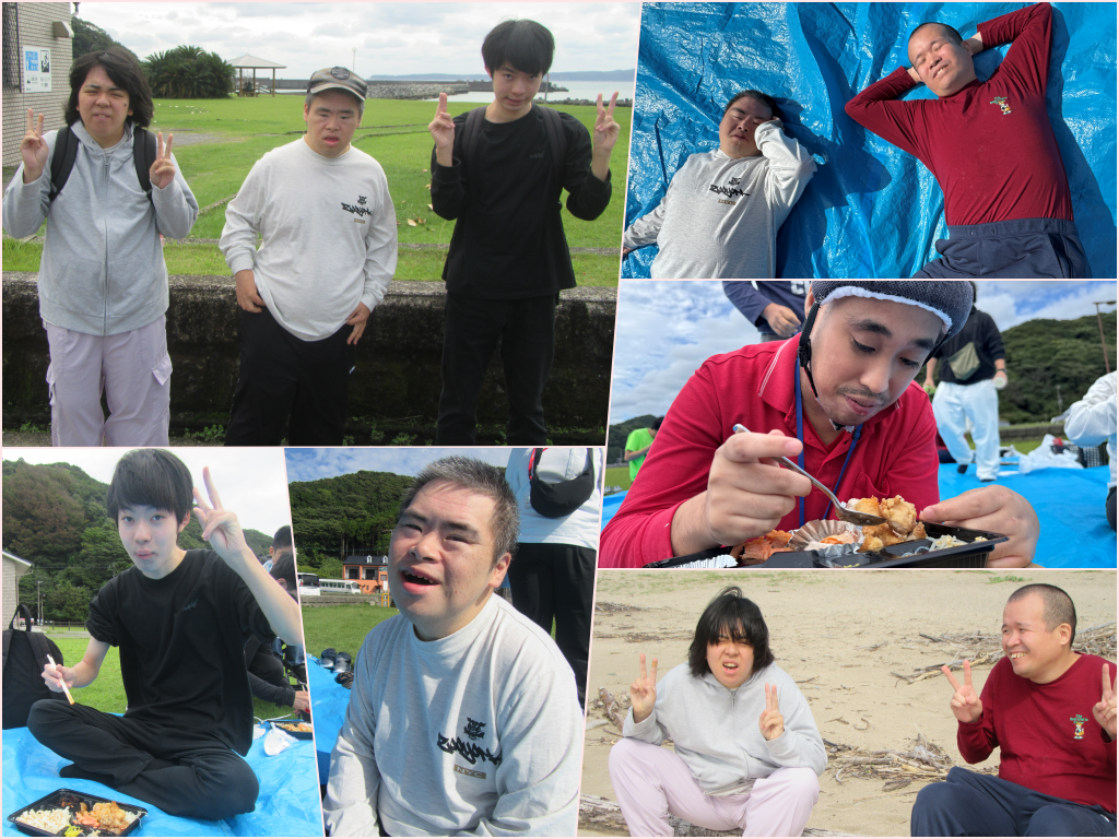 Aチームは串本町の『Sora Miru(ソラミル)』を訪問し、展示物やシアターで動画の観賞、体験コーナーなどを楽しんでいます。Bチームは『田原海水浴場』へ出かけ、海を楽しみ、芝生でお弁当を食べるなどピクニック気分を味わっています。Cチームは『鉱山資料館』にて鉱物を実際に触り、皆で昼食を食べています。みなさんとてもいい笑顔で遠足を楽しまれている様子でした。