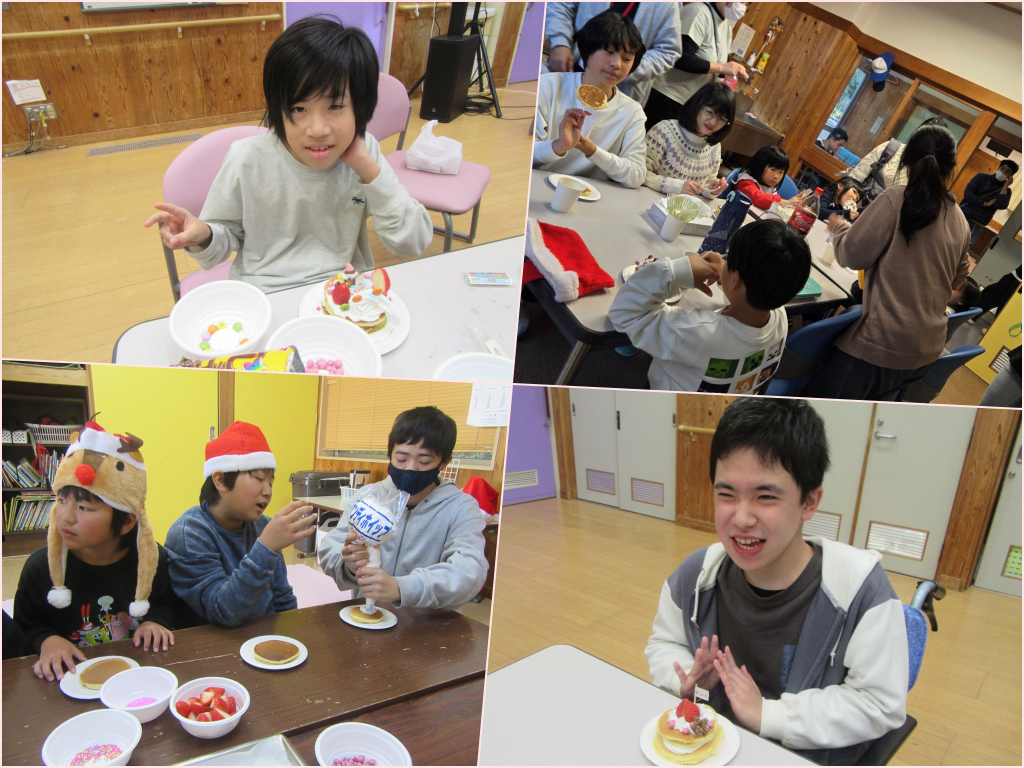 12月21日(金)に、学童クラブ『クリスマス会』を行いました。午前中のケーキ作りでは、3つのグループに分かれアイデアを出し合い美味しそうなケーキを完成させていました。午後からは、光洋中学校吹奏楽部の皆さんにお越しいただき指揮体験や素敵な演奏を楽しむことが出来ました。おやつに手作りケーキを美味しくいただき、サンタクロースにはプレゼントをもらって楽しい一日を過ごすことが出来ました。