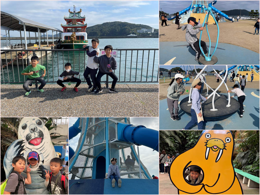 公園では初めての遊具にとても興奮した様子ではしゃぐ児童たちの笑顔が見られ、シーパラダイスでは様々な動物たちとのふれあいやイルカとのキャッチボールを楽しみました。